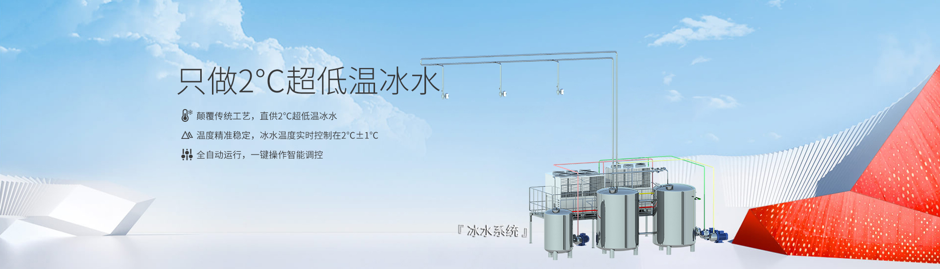 | 直供2℃超低溫冰水,徹底解決食品行業(yè)依賴制冰機(jī)制冰、人工調(diào)和冰水的低效痛點(diǎn)。 | 突破傳統(tǒng)制冰工藝限制,冰水溫度實(shí)時(shí)控制在2°±1°℃,無(wú)需人工干預(yù),杜絕溫度波動(dòng)風(fēng)險(xiǎn),保障生產(chǎn)標(biāo)準(zhǔn)化。 | 系統(tǒng)自動(dòng)恒溫補(bǔ)冷,避免制冰、碎冰、儲(chǔ)冰環(huán)節(jié)的能耗與時(shí)間浪費(fèi),綜合能耗降低30%以上。 | ||