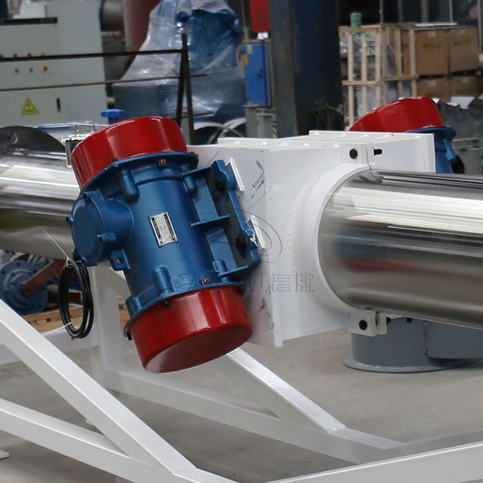 振動(dòng)給料機(jī)的基本工作原理為,設(shè)備起動(dòng)后,呈對(duì)稱(chēng)布置的兩臺(tái)相同型號(hào)和規(guī)格的振動(dòng)電機(jī)或激振器作同步反向運(yùn)轉(zhuǎn),其產(chǎn)生的激振力通過(guò)傳振體—電機(jī)或激振器底座傳遞到整個(gè)振動(dòng)體—給料槽上,使料槽作周期性振動(dòng),從而使料槽內(nèi)的物料隨之一同向排料端作定向跳躍式運(yùn)動(dòng),完成物料的輸送作業(yè)。