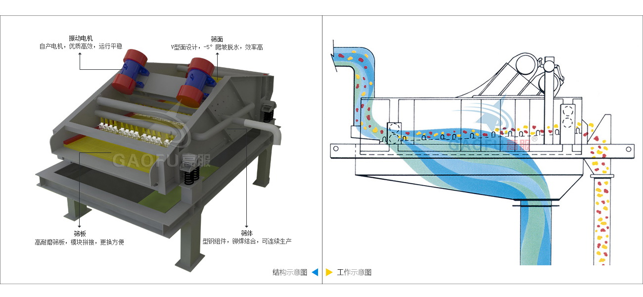脫水篩又稱高頻脫水篩,通過激振力改變了礦漿表面的水張力,漿水透過篩網(wǎng)成為篩下物,而微細物料被篩網(wǎng)阻隔形成濾層受振動力影響向前運動排出。脫水篩主要用于選礦行業(yè)的尾礦脫水、水洗石英砂脫水和陶瓷泥漿脫水,以及電力、制糖、制鹽等工業(yè)部門對中細顆粒物料進行干濕式分級、脫水、脫介和脫泥。