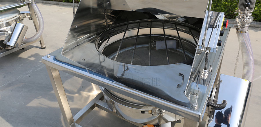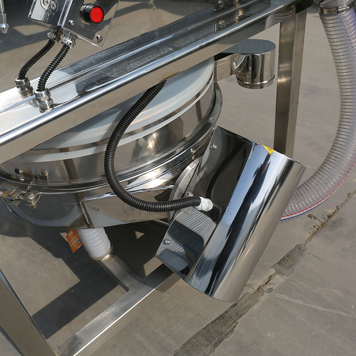 當小袋物料需解袋并倒入下一道工序時,只需人工直接拆包后投入到該系統(tǒng),投料時所產(chǎn)生的物料粉塵由集塵風機進行收集。物料通過振動篩(安全篩網(wǎng))可將大塊物料和異物攔截,從而保證符合要求的成品(合格物料)進入下道工藝。