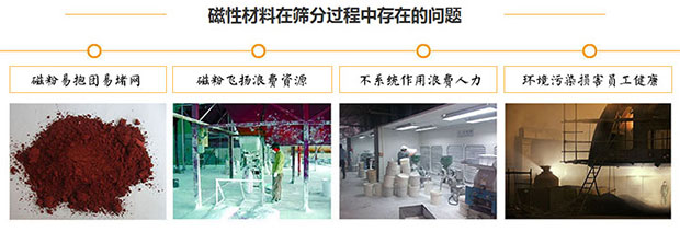 磁性材料的生產(chǎn)工序復(fù)雜,在生產(chǎn)過程中,難免會(huì)有結(jié)塊、工業(yè)雜質(zhì)和二次污染物進(jìn)入原料中,影響到品質(zhì)。所以,到后面都要進(jìn)行篩分除雜。由于磁性材料本身硬度高、粘性大、易抱團(tuán)和易飛揚(yáng);所以,生產(chǎn)過程中的篩分問題一直難以解決。北礦磁材的工程師也經(jīng)過多次實(shí)驗(yàn),使用振動(dòng)篩、超聲篩或運(yùn)用風(fēng)選及類似氣流篩的設(shè)備,
